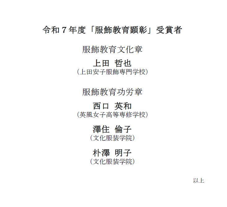 10月14日に令和7年度「服飾教育顕彰」選考委員会が開かれ、下記の被顕彰者の授章が決定いたしました。